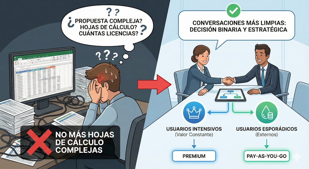 Conversaciones más limpias: Se acabaron las hojas de cálculo complejas para justificar una propuesta. La decisión ahora es binaria y estratégica: ¿Son usuarios intensivos que crean valor constante? Premium. ¿Son usuarios esporádicos o externos? Pay-as-you-go.