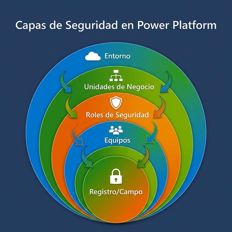 El modelo de seguridad de Power Platform tiene varias capas, cada una con su propósito específico: