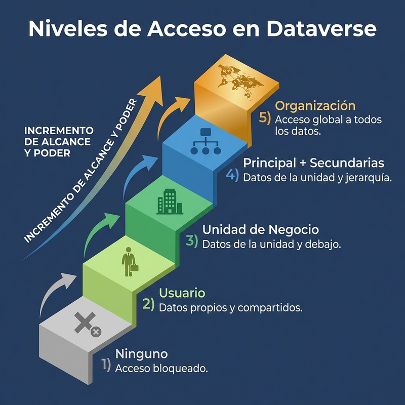 Los niveles de acceso (User, Business Unit, Parent:Child, Organization) son una configuración específica dentro de los roles de seguridad. Determinan "hasta dónde llega" cada privilegio.
