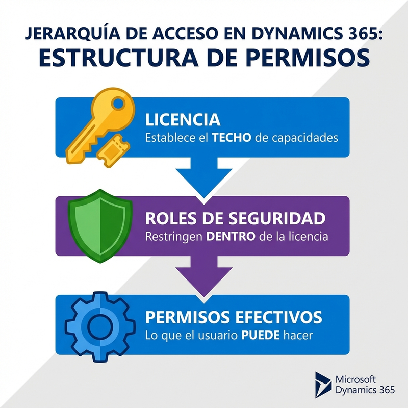 Además, la licencia establece un "techo" de capacidades. Los roles de seguridad pueden restringir dentro de lo que la licencia permite, pero nunca ampliar más allá. Si tu licencia no permite crear oportunidades, ningún rol puede darte esa capacidad.