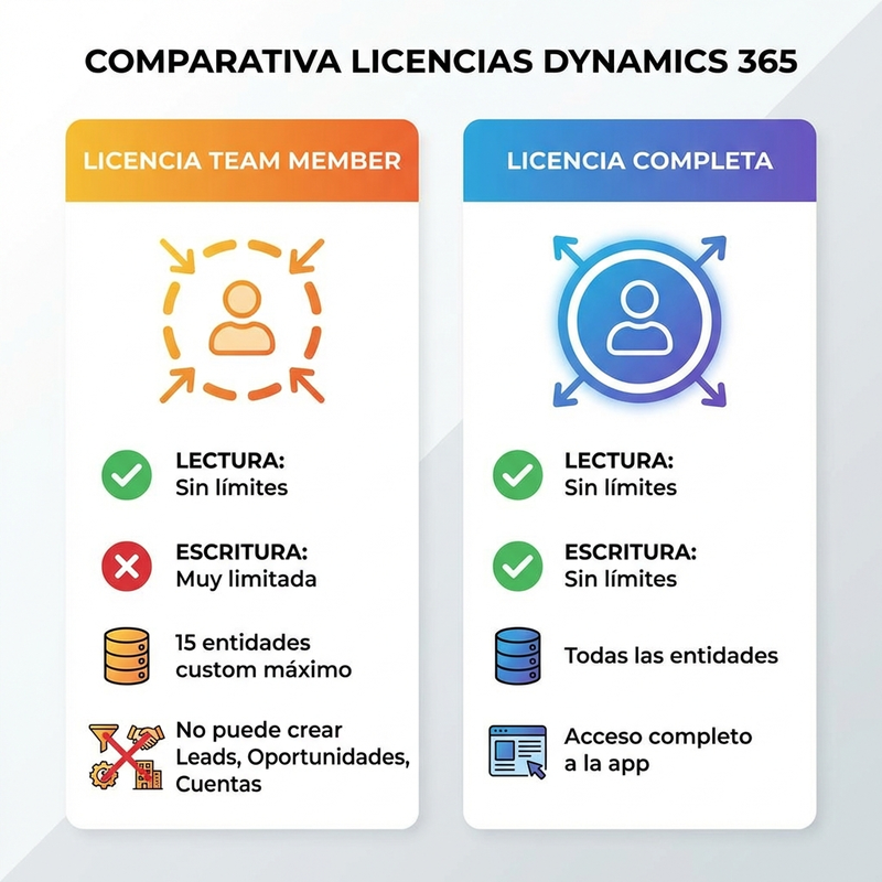 Y luego está Team Member. Esta licencia merece atención especial porque es la fuente de innumerables tickets de soporte del tipo "no puedo crear registros y no sé por qué".